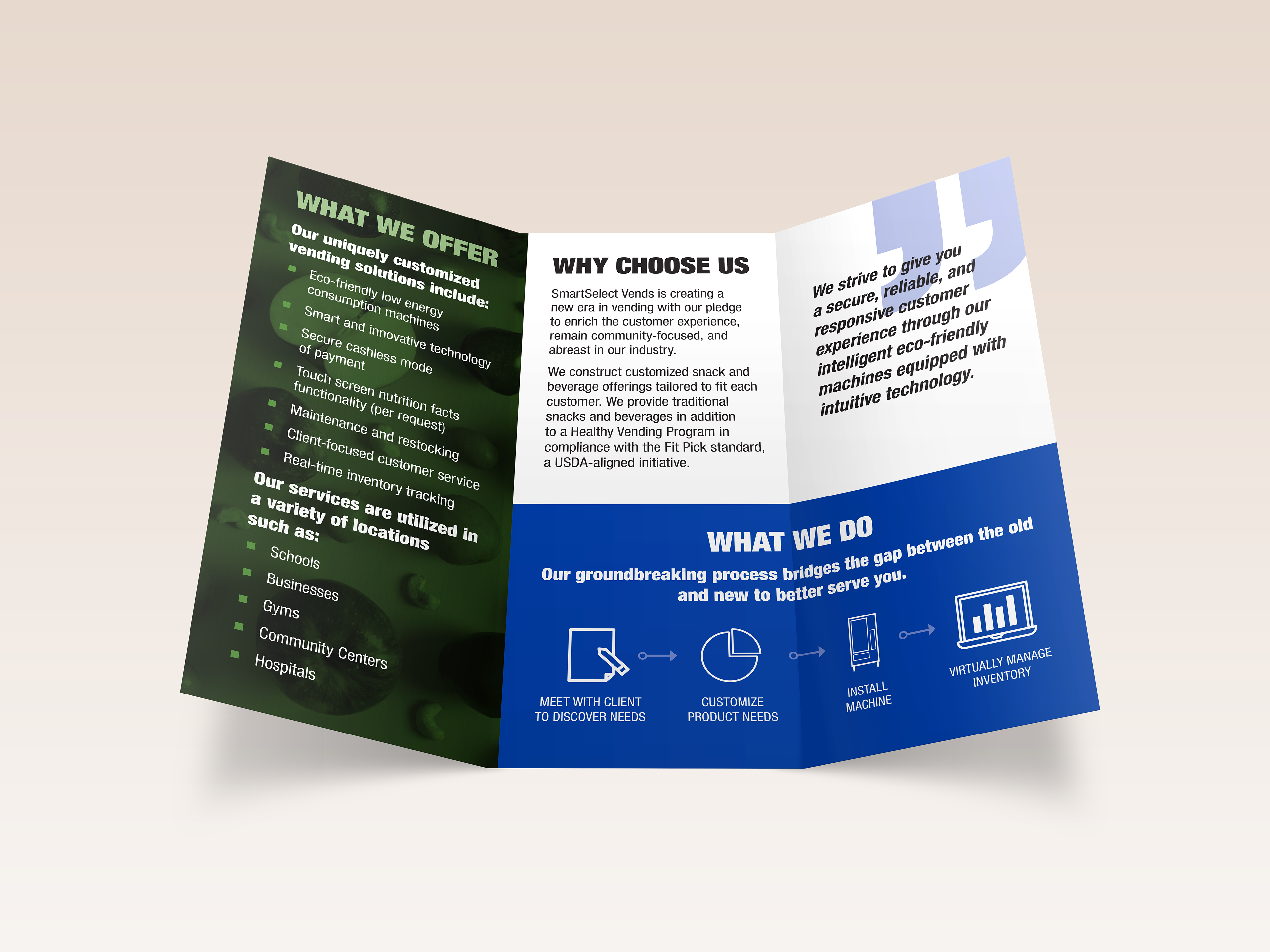 SmartSelect Vends is a start up vending machine company in Atlanta, GA with a focus in healthy vending. The owners were looking to create a brand that would act as an educator and advocate of healthy living. I began the project by creating a logo that illustrated thinking outside of the box while cultivating a healthy lifestyle.